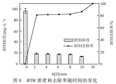 苯并噻唑(BTH)是一種工業生產常用的的化工原料,廣泛用于橡膠硫化促進劑、花青染料、造紙工藝的除粘菌劑、滅菌劑、除草劑、殺真菌劑以及抗生素藥物的生產當中。在工業廢水和城市污水中均檢測到BTH,濃度高達29. 6 ~ 110 mg·L - 1 和1. 9 ~ 6. 7 mg·L - 1 。由于BTH 的難降解性、生物抑制性、疏水性和化學穩定性,導致傳統的物化法和生物法對其去除率低僅達5% ~ 28% ,且耗費巨大。因此,需要選擇具有高效催化效率的高級氧化技術來處理這類難降解有機物。