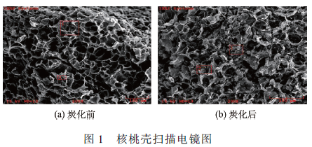 將核桃殼和氮炭化核桃殼先進行表面,采用電子掃面顯微鏡來測定其表面結(jié)構(gòu)進行表征,同時利用KBr 壓片法,掃描范圍為400 ~ 4 000 cm - 1 ,選用傅里葉變換紅外光譜儀進行官能團分析。