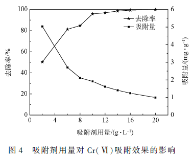 取初始濃度為20 mg·L - 1 的Cr(Ⅵ)水樣50 mL 于100 mL 的具塞錐形瓶中,調(diào)節(jié)pH 值為2. 0,吸附劑用量分別為2、6、8、10、12、14、16 和20 g· L - 1 ,設(shè)定搖床的轉(zhuǎn)速為200 r· min - 1 ,于25 ℃ 下振蕩180 min,測定吸附后的Cr(Ⅵ)的濃度。