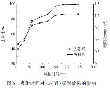 在0 ~ 60 min 內(nèi),對于組成成分是纖維素、半纖維素等吸附劑而言,吸附過程主要受Cr(Ⅵ)從溶液到吸附劑顆粒表面擴散的控制,去除效果一般,圖5 中可以看出當t = 60 min 時,Cr(Ⅵ)的去除率為77. 8% ,隨著吸附時間的延長,其去除率與吸附量也逐漸增大。當吸附時間增加至180 min 時,去除率達到99. 1% ,再延長時間,去除率趨于平衡,這可能是因為吸附劑吸附能力達到飽和,也就是說吸附劑表面的活性位點和炭化后所增加的官能團已全部吸附了Cr(Ⅵ)離子,故其去除率不再增加。因此選取吸附時間為180 min。