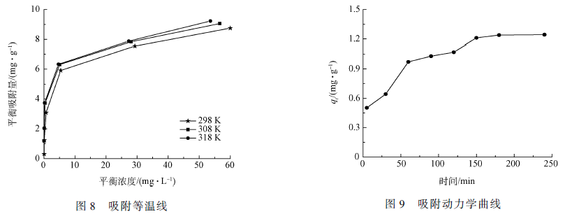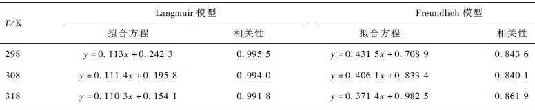 如圖8 所示,隨著反應(yīng)溫度的升高,氮炭化核桃殼對吸附質(zhì)(Cr(Ⅵ))的吸附量也在逐漸增加,且吸附等溫類型屬于I 型。當溫度為298 K、308 K 和318 K 時,其最大吸附量依次為8. 751 mg·g - 1 、8. 963 mg·g - 1 和9. 151 mg·g - 1 。將實驗所得數(shù)據(jù)進行等溫模型擬合,其結(jié)果如表1 所示。
