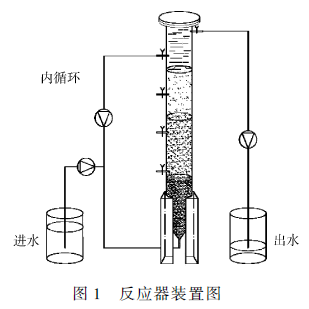 本研究采用的反應器如圖1 所示。反應器由有機玻璃制成,內徑50 mm,有效高度555 mm,有效容積1. 08 L,反應溫度控制為室溫。反應器系統包括進水系統、反應系統、內循環系統和出水系統,整個系統控制為缺氧狀態。