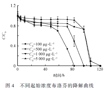 通過惰性吸附實驗和生物降解實驗的對比,可以探討SDB 活性污泥對IBU 的處理能力及其去除機理。從圖4 可以看出,在反應時間24 h 內,IBU 濃度下降緩慢,去除率為6. 7% ~ 18. 1% 。此時,SDB 主要通過吸附作用將水相中的IBU 轉移至胞體上 ,IBU 的比去除量分別達到0. 5、1. 6、3. 1 和6. 8 μg·(g MLVSS·h) - 1 。對比圖3 可知,活性污泥的生物吸附作用比較弱,這是由于滅活污泥的細胞表面發生了結構變化,通透性增強,污染物易進出細胞內部,因此細胞會表現出更好的污染物積累效果,同時污染物也容易發生解吸,故在24 h 內,滅活污泥比活性污泥對IBU 的吸附作用強。在生物降解反應后期,隨著培養時間的延長,生物降解作用逐漸增強,從60 h 后,SDB 開始加快對IBU 的降解作用,IBU 濃度急劇下降,直至降為零。隨著IBU 起始濃度的增加,SDB 完全降解IBU 所需的時間增加,時間跨度為82 ~ 106 h,而SDB 對IBU 的單位去除速率進一步增加,比去除量分別為0. 76、2. 49、6. 5 和23. 8 μg·(g MLVSS·h) - 1 。