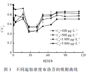 準備適量的SDB 活性污泥,在高壓滅菌鍋中121 ℃ 條件下滅菌30 min,對污泥中的微生物進行滅活,考察滅活污泥對IBU 的吸附作用。批次實驗中,向錐形瓶(0. 5 L)內加入一定量沉降后的SDB 滅活污泥(約50 mL),使MLVSS 控制為1. 5 g·L - 1 ,隨后加人工配水至500 mL,最后加入適量的IBU 儲備液,使其濃度分別為0、100、500、1 000 和5 000 μg·L - 1 ,使用封口膜隔絕空氣,采用磁力攪拌進行攪拌(室溫,200 r·min - 1 ),反應進行6 d。每隔一定時間取上清液,并用0. 22 μm 的水相濾膜過濾到樣品瓶中,將樣品保存在4 ℃ 的冷庫中于24 h 內測樣。比較不同IBU 濃度下,SDB 污泥對IBU 的吸附。同時設置空白對照組,每組實驗均設置3 個平行。