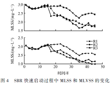 從圖3 可以看出,在SBR 處理高鹽生活污水啟 動期,投加復合菌劑及菌填料對SBR 的TOC 去除率有非常顯著的提高 ,第15 天到25 天,復合菌劑投加過程中,R1、R2 的TOC 去除率能夠穩定在80% 左右,而R3 的TOC 去除率僅僅從25% 提升至40% ;第26 天至45 天,SBR 運行過程中,R3 的TOC去除率并沒有顯著的提高,直到40 d 才出現緩慢提高的趨勢。第35 天以后,R1 和R2 的TOC 去除率均可以穩定在85% 左右,可認為SBR 處理高鹽生活污水啟動完成 ,而直到65 d,R3 的TOC 去除率僅為65. 3% 。此外,對比R1 和R2,在第二階段的出水TOC 呈現出一致性,而在第三階段,R2 的運行狀況明顯更加穩定,這也說明投加負載菌填料能夠為復合菌劑提供更加穩定的環境,懸浮填料表面即可觀察到一層褐色黏膜附著,證明微生物開始附著生長,生物膜逐漸形成。SBR 快速啟動過程中MLSS 及MLVSS 的變化規律如圖4 所示。R1、R2 和R3 的MLSS 及MLVSS 整體均呈現出先下降,后上升的趨勢。這是由于起初活性污泥微生物受到高鹽度的抑制甚至毒害,導致生物量降低,而隨著污泥的馴化,嗜鹽微生物逐漸開始增殖。值得一提的是R2 的MLSS 劇減,可能是由于投入填料后,部分微生物附著在填料上,從而導致反應器內懸浮固體濃度減少。此外,R1、R2 和R3 MLVSS/ MLSS 的值由0. 068 5 分別降低至0. 623、0. 624 和0. 561,有研究證明高鹽廢水下的活性污泥絮體致密、沉降性能好,這可能是鹽在嗜鹽微生物體內富集導致的。
