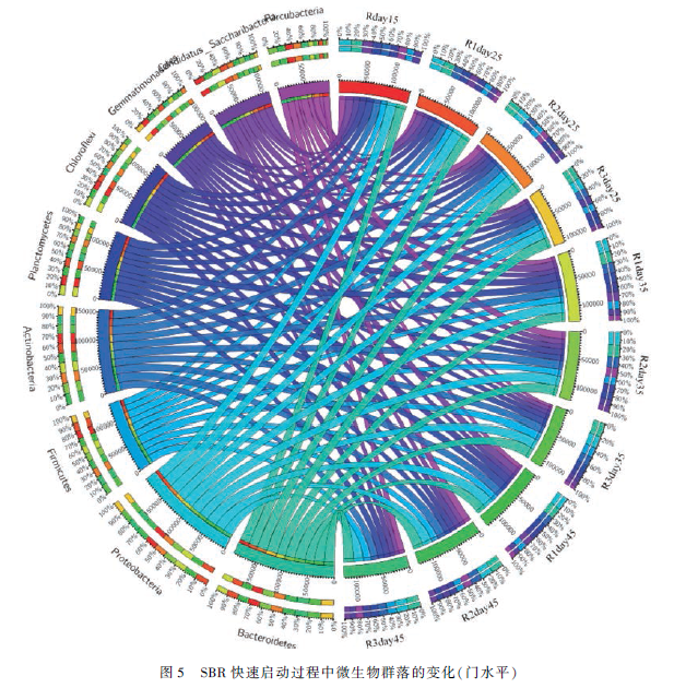 3)實驗結果表明復合菌劑的引入導致系統內菌群競爭優勢的變化,使整個系統快速適應水質變化,處理效率提高,而通過啟動完成后的生物群落結構分析可以看到所投加的耐鹽高效菌O1 和Y5 在活性污泥微生物總量中所占比例由1. 31% 升高至6. 13% ,說明O1 和Y5 能夠在小試SBR 中長期存留,并逐漸成為優勢種屬之一。