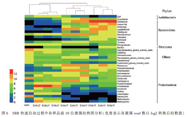 4 組實驗的微生物群落結構熱圖和主成分分析是基于各樣品中含量前10 位菌屬共計34 種菌屬(如圖6 和7 所示)。根據主成分分析的聚類結果,可以將R1 和R2 的啟動分為3 個階段,這與反應器運行的狀況相吻合。第一階段(1 ~ 15 d),反應器中活性污泥還處于適應期,進水為普通生活污水,主要以變形菌門中,如不動桿菌屬(Acinetobacter)、布蘭漢氏菌屬(Alkanindiges)、嗜門菌屬(Methylophius)和生絲微菌屬(Hyphomicroblum)等占優勢;第二階段(15 ~ 25 d),開始以高鹽廢水為進水,此時鹽度的沖擊負荷使得微生物群落結構反生改變,變形菌門中的微生物豐度進一步增加,并達到最大豐度;第三階段(25 ~ 45 d),經過一段時間的運行和馴化,擬桿菌門中,如鳥桿菌屬(Gelidibacter)、黃桿菌屬(Flavobacterium)、碳酸噬胞菌屬(Aequorivita)等逐漸成為優勢種屬,而變形菌門中的微生物豐度下降。有趣的是,由于復合菌劑和菌填料的投加,第二階段芽孢桿菌屬(Bacillus) 的豐度上升,并在之后的運行中逐漸成為優勢種屬,而這一階段R1 與R2 對TOC 的去除率也遠高于R3,因此,復合菌劑的投加對改善生物工藝有機物去除效果,縮短啟動時間具有顯著的效果。具體參見污水寶商城資料或http://www.bnynw.com更多相關技術文檔。