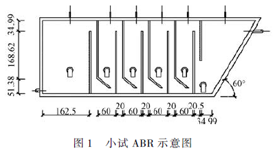 反應器的長× 寬× 高= 550 mm × 102 mm × 255mm,超高35. 39 mm,有效容積12. 32 L。第1 格室(160 mm × 102 mm × 255 mm)的容積是2、3、4 和5格室(80 mm × 102 mm × 255 mm)的2 倍,能更有效的去處懸浮物,而第5 格室后加60°的傾角的沉降格室。