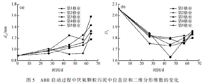 圖5 是ABR 啟動過程中厭氧顆粒污泥中位直徑和二維分形維數的變化曲線。由圖5(a)可知,顆粒污泥的中位直徑并不是隨著ABR 的運行呈線性增長,在反應器啟動初期,污泥生長速度緩慢,隨著反應器的運行,有機物濃度逐漸增加,顆粒污泥的生長速度也逐漸增快。經過64 d 的啟動以后,ABR 5 個格室中顆粒污泥的中位直徑分別達到了(第1 到第5 格室)1. 58、1. 42、1. 32、1. 28 和1. 18 mm。和姜瀟的研究結果在同一量級上。此外,ABR 啟動階段顆粒污泥的平均生長速度(10 - 3 mm·d - 1 ) 分別是10. 8、8. 3、6. 7、6. 1 和4. 5。一般情況下,二維分形維數(D2 )表示顆粒的致密程度,其值越接近于2 表明顆粒的結構越致密。圖5(b)顯示,隨著ABR 啟動時間的延長,5 個格室中的污泥D2 均呈下降趨勢,在啟動的第1 階段下降趨勢最為明顯,由最初的2. 06 下降到1. 63 ~ 1. 80 之間,說明隨著顆粒污泥尺寸的增加其致密程度不斷下降。此后,污泥D2 的下降趨勢逐漸趨于平緩,并且在啟動的第3 和第4 階段出現了上升趨勢。在ABR 完成啟動之后,污泥的D2 為1. 80 ~ 1. 86,較原始顆粒污泥有所下降。