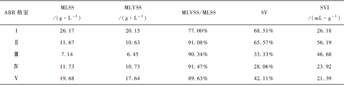 表2 為ABR 啟動成功后各格室顆粒污泥的理化特征?梢,ABR 第3 格室中顆粒污泥的MLSS 在5. 0 ~ 10. 0 g·L - 1 之間 ,其他格室中厭氧顆粒污泥的MLSS 均大于10. 0 g·L - 1 。第1 格室厭氧顆粒污泥的有機組分的比例為77. 00% ,第2、3、4 和5 格室均大于89% ,遠高于姜瀟的50% ,高于接種污泥。說明反應器各格室污泥中生物質的含量普遍較高,這可能是由于接種污泥為UASB 中的顆粒污泥、ABR 的高負荷啟動和運行等因素所導致的結果。反應器各格室中污泥顆粒的沉降比(SV)大小順序為I> Ⅱ > Ⅴ > Ⅲ > Ⅳ。從污泥體積指數(SVI) 可以看出,第4 格室中顆粒污泥的SVI 最小,第2 格室中的SVI 最高。這表明第2 格室中顆粒污泥的沉降性能和壓縮性能最好,而第4 格室最差,高于提出的顆粒污泥SVI 為10 mL·(g SS) - 1 的數值。