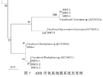 3)PCR-DGGE 分析結果表明,ABR 從第1 格室到第5 格室微生物的種類和豐度依次遞減,不同格室中微生物群落發生了演替。其中序列最相似的產酸菌包括:Raoultella ornithinolytica、Uncultured Clostridialesbacterium、Staphylococcus sp. 、Propionibacterium sp. 、Uncultured Acidobacteria bacterium、Brevibacterium casei等,序列最相似的產甲烷菌Uncultured Firmicutes bacterium 等,以及序列最相似的產氫菌Uncultured Clostridiumsp. 等。