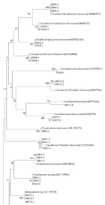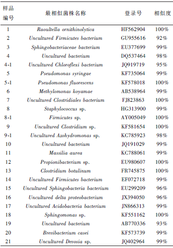 圖7 為采用MEGA5 軟件,Neighbor-joining 法構建系統發育樹,自展數(bootstrap)為100。從DGGE結果中可以看出有很多完全屬于同一物種的條帶:Pseudomonas fluorescens、Pseudomonas syringae 和CQ5-3,CQ1-1、CQ1-2、CQ1-3 和Raoultella omithinolytica等組合,它們每一組在系統發育樹中都完全處于同一個OTUs (Operational taxonomic units)。選取DGGE 圖譜中比較有代表性的21 條條帶,進行目標序列以及相關性序列的對比分析(見表3)。由表3可知,除了樣品2 和樣品19 的相似比例僅為92%和93% 外,其余條帶與基因庫中已有物種的相似比例都在95% 以上。計算出主要條帶序列所占比例,序列最相似的產酸菌包括:Raoultella ornithinolytica、Uncultured Clostridiales bacterium、Staphylococcus sp. 、Propionibacterium sp. 、Uncultured Acidobacteria bacterium、Brevibacterium casei 等,產甲烷菌為UnculturedFirmicutes bacterium 等,產氫菌為Uncultured Clostridiumsp. 等。