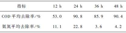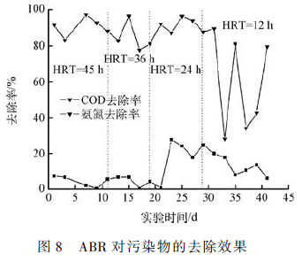 圖8 為HRT 對ABR 去除COD 和氨氮的影響曲線,以豎線為間隔,從左到右依次為48、36、24 和12 h。由此可見,當HRT 分別為48 和36 h 時,ABR的處理效果比較穩定。當HRT 縮短到24 h 時,COD的去除率依舊保持在80% 以上,氨氮的去除率開始升高;繼續縮短HRT 為12 h,污泥負荷隨之增加,導致COD 和氨氮的去除率均有明顯降低。結合表4 的平均去除率可知,該ABR 適合的HRT 為24 h。