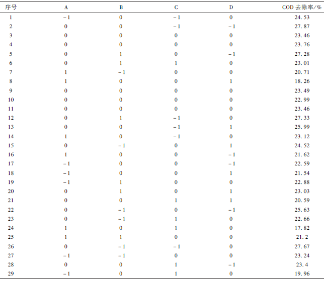 實(shí)驗(yàn)因素與水平設(shè)計(jì)如表1 所示,響應(yīng)面實(shí)驗(yàn)運(yùn)行結(jié)果見表2。調(diào)節(jié)池出水COD 為835. 34 mg·L - 1 。