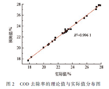 根據(jù)圖2 可以看出,模型的預(yù)測值與實(shí)際值差別較小, COD 去除率的線性擬合相關(guān)系數(shù)達(dá)到0. 996 1,說明實(shí)驗(yàn)中建立的模型能較好的反映各主要因素的影響,模型與實(shí)際情況吻合。