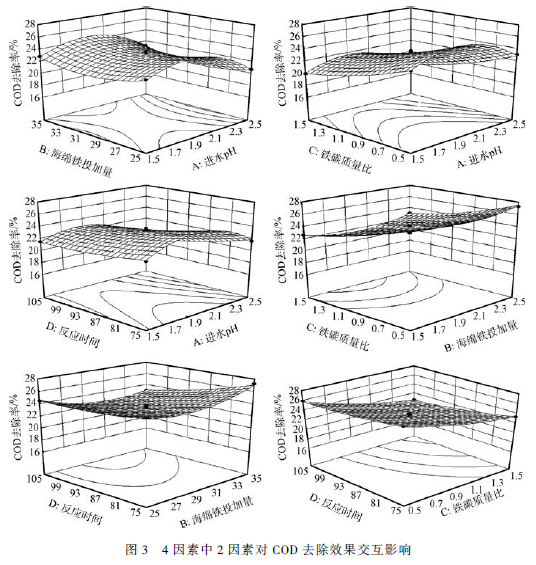 根據(jù)回歸分析的結(jié)果,軟件運(yùn)行產(chǎn)生的響應(yīng)曲面圖(見圖3)。從曲面圖的陡峭程度依次可以看出,在固定2 因素后其余2 因素對腈綸廢水COD 去除效果的交互影響,即影響程度大小。綜合曲面圖及ANO-VA 分析中各因素F 值大小可以看出C(1 456. 17) > D(360. 3) > A(248. 55) > B(0. 16),即在所選實(shí)驗(yàn)因素水平值范圍內(nèi),其影響腈綸廢水COD 去除效果的主次因素依次為鐵碳質(zhì)量比、反應(yīng)時間、進(jìn)水pH、海綿鐵投加量。而各因素對COD 去除效果的影響分析已呈現(xiàn)在單因素實(shí)驗(yàn)中,在此不予贅述。