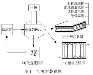 電吸附裝置主要由電容去離子模塊、電導率儀、蠕動泵和直流穩壓電源構成(見圖1)。電容去離子模塊內共布置9 對泡沫鎳/ 活性炭電極,正負極板間距1. 0 mm,極板間9 條過水通道串聯布置,原水以折線流方式流經電極表面,并在蠕動泵作用下在裝置內循環流動。