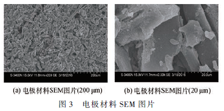 利用S-3400N 型掃描電鏡對電極表面形態進行成像分析,如圖3(a)所示。在200 μm 視窗下可見,活性炭電極材料均勻覆蓋在泡沫鎳集流體上,呈不規則的堆砌結構;在20 μm 視窗下(見圖3(b)),活性炭與導電炭黑在PVDF 作用下均勻分散,粘結劑沒有覆蓋在活性炭表面上,活性炭電極具有較大的外表面積,活性炭之間形成多孔通道結構,具有豐富的吸附位點。