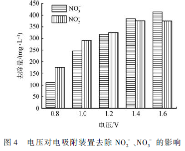用溶液電導率折算為溶液質量濃度,研究電吸附裝置對NO2 - 和NO3 - 去除效果。由圖4 可知,隨著電壓升高,裝置對NO2 - 和NO3 - 的去除量顯著提高。裝置在1. 6 V 時對NO3 - 的吸附量最大達到414. 49mg· L - 1 ,在1. 4 V 時對NO2 - 的去除量最大達到375. 37 mg·L - 1 ,較0. 8 V 時分別提高272. 71% 和114. 48% 。在該濃度下,由于電極材料對NO3 - 的吸附具有選擇性, 因此, 在電壓為1. 4 V 時, 裝置對NO3 - 的電吸附量略大于NO2 - 。