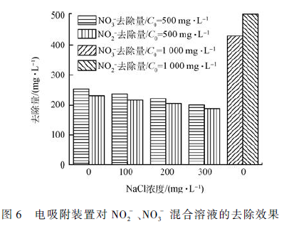 如圖6 所示,當混合溶液中NO2 - 與NO3 - 的濃度均為500 mg·L - 1 時,裝置對NO3 - 的吸附量和去除率均高于NO2 - ,而當NO2 - 與NO3 - 的濃度均為1 000mg· L - 1 時, 裝置對NO2 - 的吸附量較NO3 - 高出16. 77% 。導致這一現象的可能原因是,在低離子濃度條件下,電極材料微分孔容內的雙電層發生嚴重重疊,使離子半徑較小的NO2 - 無法進入微孔中存儲,而該電極材料表面的官能團種類可能有利于NO3 - 的吸附和儲存。李智等的研究也表明,碳基電極材料在一定濃度范圍內對NO3 - 存在選擇性吸附,所以在低濃度下裝置對NO3 - 的吸附量大于NO2 - 。隨著濃度的提高,離子濃度和電荷密度成為影響電極材料吸附容量的主導因素,高濃度下雙電層分散層厚度被壓縮,微孔雙電層疊加效應減弱,微分孔容電容量被釋放出來, NO2 - 開始進入微孔存儲,在高濃度下裝置對NO2 - 的去除效果優于NO3 - 。