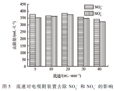在電容去離子技術中,流速也是影響電吸附效果的重要因素。流速太低,離子停留在電極表面時間過長,可能會重新回到主體溶液中,且在低流速下由于裝置單位時間內處理的水量較少,運行的能量利用率低;但流速太高,流體紊亂度加強,使電極表面形成的雙電層被壓縮,裝置電吸附容量也會降低。在進水濃度為500 mg·L - 1 ,工作電壓為1. 4 V 的條件下,分別以5、10、20、30 和40 mL·min - 1 的進水流量進行電吸附實驗,考察流速對裝置電吸附去除NO2 - 和NO3 - 效果的影響。