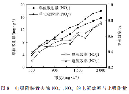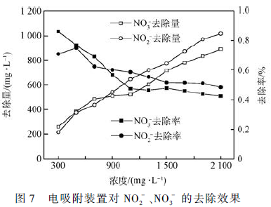 在電吸附裝置最佳運行工況下,當進水濃度分別為300 ~ 2 100 mg·L - 1 時,研究裝置對的NO2 - 和NO3 - 的去除效果。如圖7 所示,裝置在最佳工況下對NO2 - 和NO3 - 的吸附量由最初的212. 94 和258. 85mg·L - 1 分別提高到1 016. 99 和891. 00 mg·L - 1 ,但去除率均在下降。在靜電作用和粒子熱運動相互作用下,電極表面的雙電層由靠近電極一側的緊密層和與溶液接觸的分散層構成,緊密層厚度較薄,一般不超過1 nm,而分散層的厚度與溶液濃度緊密相關,當溶液濃度較低時,分散層厚度較厚,實驗采用的活性炭微孔含量較高,在低濃度時微孔中發生雙電層重疊效應而使微孔不具有電吸附容量,隨著濃度提高,雙電層分散層厚度被壓縮,微孔雙電層疊加效應減弱,微分孔容電容量被釋放出來,使電極電吸附容量隨著濃度的升高而升高,但溶液濃度升高的幅度大于電吸附裝置去離子容量增加的幅度,使電吸附裝置離子去除率在不斷降低。同時可見,當溶液濃度低于800 mg·L - 1 時,裝置對NO3 - 的去除量和去除率大于NO2 - ,而在濃度超過800 mg·L - 1 時,現象相反。原因在于在較低濃度下微孔雙電層疊加效應使離子半徑較小的NO2 - 無法進入微孔存儲,以及活性炭對NO3 - 可能存在特性吸附行為所致。