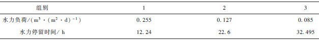 實驗動態柱采用高150 mm、內徑60 mm 的圓柱形有機玻璃管,內部基質填料從下至上為高10 mm 粒徑3 ~ 5 mm 石英砂層、20 mm 固定化顆粒、高10 mm粒徑3 ~ 5 mm 石英砂層,進水采用自下而上的連續運行方式,進水量用蠕動泵和流量計調節控制。固液比為2 ∶ 11。實驗裝置如圖3 所示。共設置3 組動態柱,按不同水力負荷及水力停留時間分為1# 、2# 和3#動態柱,見表1 所示。