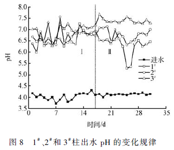 出水pH 值的變化規律如圖8 所示。各動態柱進水pH 值為(3. 95 ± 0. 22),早期1# 、2# 和3# 柱平均出水pH 值分別為6. 57、6. 68 和6. 94。表明固定化顆粒對pH 值有較強的提升能力。這是由于固定化顆粒內鐵屑以及改性麥飯石中的鈣堿性物質能與水樣中H + 反應,迅速提升體系的pH 值 。其中3#柱pH 提升能力最強,這可能是由于3#柱水力停留時間較長,SRB 活性較強,在生物—化學反應中消耗水中更多的H + ,更大幅度的提升pH 值。后期提高污染負荷,1# 、2# 和3# 柱出水pH 變為6. 35、6. 75 和7. 38。3# 柱仍具有較強的pH 提升能力。這可能是由于3#水力停留時間長,此時仍具有較強活性的SRB 異化代謝SO4^2- 的過程中能產生更多的堿度,進一步提升出水pH 值,出水pH 遠高于其余兩柱。具體參見污水寶商城資料或http://www.bnynw.com更多相關技術文檔。