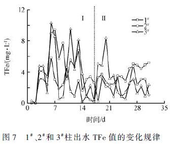 由圖7 可知,早期1# 、2# 和3# 動態柱出水總鐵元素TFe 平均濃度分別為2. 06、4. 48 和4. 03 mg ·L - 1 。第6 天,3#柱TFe 釋放量達到最高10. 28 mg·L - 1 ,之后在1. 83 ~ 9. 51 mg·L - 1 范圍波動。這可能是由于早期進水pH 值較低,固定化顆粒內Fe0 與溶液中較多的H + 反應形成Fe2 + ,致使體系中Fe2 + 濃度較高。后期TFe 含量有所降低,可能是由于微生物異化還原SO4^2- 生成的H2 S 與體系中Fe2 + 生成FeS 沉淀,從而降低TFe 濃度。當提升污染負荷后,1# 、2# 和3# 柱出水TFe 平均濃度分別為3. 14、2. 65 和2. 69 mg·L - 1 。3# 柱TFe 釋放量較低,這可能是由于前期顆粒內鐵屑被大量消耗導致后期含量不足,Fe2 + 濃度下降,同時生成的金屬硫化物沉淀沉積在顆粒表面及麥飯石內部孔道,堵塞孔隙,進一步減少顆粒TFe 釋放量。