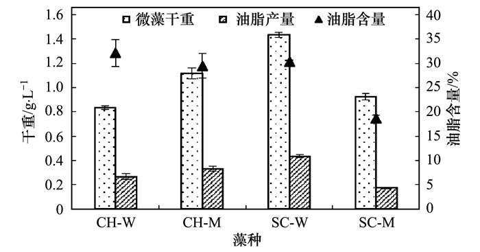 由圖 2可知, 利用城市污水培養微藻, 微藻干重由大到小依次為SC-W、CH-M、SC-M、CH-W, 且彼此有顯著性差異(P < 0.05).該排序與D680值排序不同, 主要由于藻種差異, 小球藻個體較小, 單個藻體質量較小, 斜生柵藻個體較大, 單個藻體質量大, 所以雖然D680值CH-M大于SC-W, 但微藻干重SC-W藻種大于CH-M藻種.微藻油脂含量由多到少依次為:CH-W、SC-W、CH-M、SC-M, 前三者無顯著性差異, 但明顯高于SC-M的油脂含量.兩者綜合而言, 所得微藻油脂產量大小依次為:SC-W、CH-M、CH-W、SC-M, 分別為0.43、0.33、0.27、0.17 g·L-1, 且彼此有顯著性差異(P < 0.05).因此SC-W藻種在4種微藻中油脂產量最高, 是其他3種微藻油脂產量的1.3、1.6、2.5倍.從該試驗結果也可以看出, 經離子注入誘變后的小球藻能較好地保持其優良性能, 而經離子注入誘變后的斜生柵藻隨著時間推移, 藻種性能發生了退化.