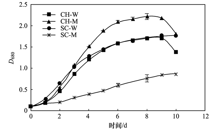 將4種微藻CH-W、CH-M、SC-W、SC-M按照初始濃度D680=0.1分別接種到城市污水原污水中.每天測一次D680值監測其生長情況(圖 1).由圖 1可知, CH-M、CH-W、SC-W藻種在污水中生長情況良好, 具有較強耐污性能, D680最高可達1.5以上, 其中CH-M藻種D680最高.而SC-M藻種雖能保持持續生長, 但生長速率較低.后期的觀察發現, CH-W與CH-M分別于第9d進入快速衰亡期, 而SC-W、SC-M均可以長時間保持在生長穩定期.從穩定性培養的角度看SC-W、SC-M更具有優勢.