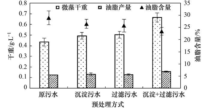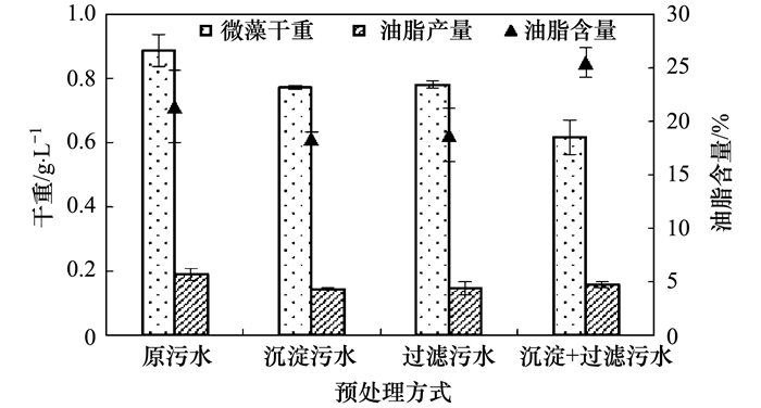 城市污水采用原污水、沉淀污水、過濾污水、沉淀+過濾污水這4種預處理方式, 預處理后的污水水質情況如表 4所示.將SC-W、CH-M按照初始濃度D680=0.1分別接種到不同預處理方式處理后的城市污水中, 取穩定期的藻液測其微藻干重, 油脂產量并計算其油脂含量.所得結果如圖 3、圖 4所示.