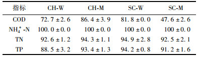 由表 4可知, 城市污水中COD含量經沉淀處理后變化不大, 經過濾、沉淀與過濾聯合處理后降低.城市污水中NH4+-N、TN、TP含量經沉淀、過濾處理后有所降低, 經沉淀與過濾聯合處理后進一步降低.總體而言, 原污水中氮、磷等營養物質較為豐富, 但懸浮物也較多, 隨著處理程度的加深, 懸浮物減少, 但污水中的營養物質損耗也會相應增加.