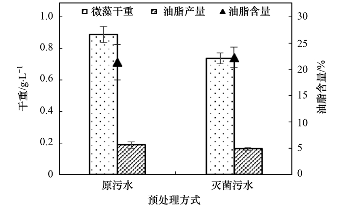 由圖 5、圖 6可知, 與不同的微藻具有不同的耐污性能相似, 滅菌對不同微藻的生長與產脂的影響也不同.耐污性能較強的SC-W在原污水中生物質與油脂產量高于滅菌污水中的生物質與油脂產量, 油脂含量兩者相差不大, 滅菌組略高.故SC-W在原污水中油脂產量較高主要歸因于其生物質產量較高, 說明城市污水中的細菌對SC-W的生長有促進作用, 該結論與Ryu等所得結論一致.而CH-M在滅菌污水中生物質產量較高, 說明城市污水中的細菌對CH-M的生長有一定的抑制作用.滅菌組與原污水組的油脂產量無顯著性差異.