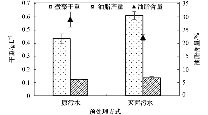 對城市污水進行滅菌預處理, 以原污水作為對照.將SC-W、CH-M按照初始濃度D680=0.1分別接種到不同預處理方式處理后的城市污水中, 取穩定期的藻液測其微藻干重, 油脂產量并計算其油脂含量.所得結果如圖 5、圖 6所示.
