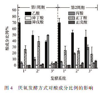 研究發(fā)現(xiàn),微生物是影響SCFAs 成分的主要因素。由圖4 可知,3 個(gè)發(fā)酵系統(tǒng)中乙酸均為主要成分,與其他學(xué)者研究相似 。1#酸化系統(tǒng)中乙酸比例最大分別為69. 55% 和69. 70% (第1、2 個(gè)反應(yīng)周期),3# 發(fā)酵系統(tǒng)中乙酸比例最小分別為38. 41%和46. 35% (第1、2 個(gè)反應(yīng)周期),說明乳渣廢水發(fā)酵中偏酸條件有利于乙酸積累。同時(shí)發(fā)現(xiàn),第2 個(gè)反應(yīng)周期中乙酸積累率大于第1 個(gè)反應(yīng)周期,這是因?yàn)橥彤a(chǎn)乙酸菌是一種嗜低溫微生物,而且醋酸菌對于高溫較敏感,而由圖2(b)可知,第2 個(gè)反應(yīng)周期內(nèi)溫度明顯低于第1 個(gè)反應(yīng)周期,所以該反應(yīng)周期內(nèi)乙酸積累較高。研究發(fā)現(xiàn),在15 ~ 55 ℃ 的污泥堿性發(fā)酵過程中乙酸的積累率為40. 7% ~36. 6% ,而本研究發(fā)現(xiàn),乳渣廢水乙酸積累率可達(dá)到70% 。因此,乳渣廢水在中性或者酸性條件下厭氧發(fā)酵能夠有效的提取乙酸。分析數(shù)據(jù)可知,與乙酸比例相反,2 個(gè)反應(yīng)周期內(nèi)3# 發(fā)酵系統(tǒng)丙酸積累比例最大分別為49. 27% 和29. 43% ,1#發(fā)酵系統(tǒng)中丙酸比例最小分別為4. 19% 和5. 89% 。結(jié)果表明,3# 酸化系統(tǒng)中丙酸轉(zhuǎn)化率較低,導(dǎo)致該系統(tǒng)中乙酸含量最低。研究發(fā)現(xiàn),污泥堿性發(fā)酵過程丙酸積累率僅為22. 9% ~ 14. 9% ,而本研究中發(fā)現(xiàn),丙酸積累率可達(dá)50% ,說明中性條件下乳渣廢水能夠提取大量的丙酸。2# 發(fā)酵系統(tǒng)中正丁酸比例最高為38. 85% ,3# 系統(tǒng)最低約為3. 36% 。3 個(gè)發(fā)酵系統(tǒng)中異丁酸、異戊酸和正戊酸含量較低幾乎為零。說明乳渣廢水通過水解酸化反應(yīng)能夠有效促進(jìn)長鏈酸向短鏈酸轉(zhuǎn)化。