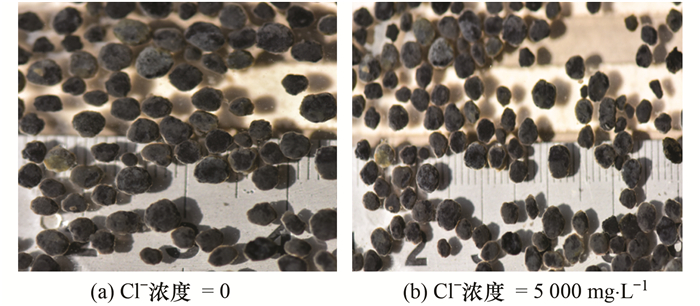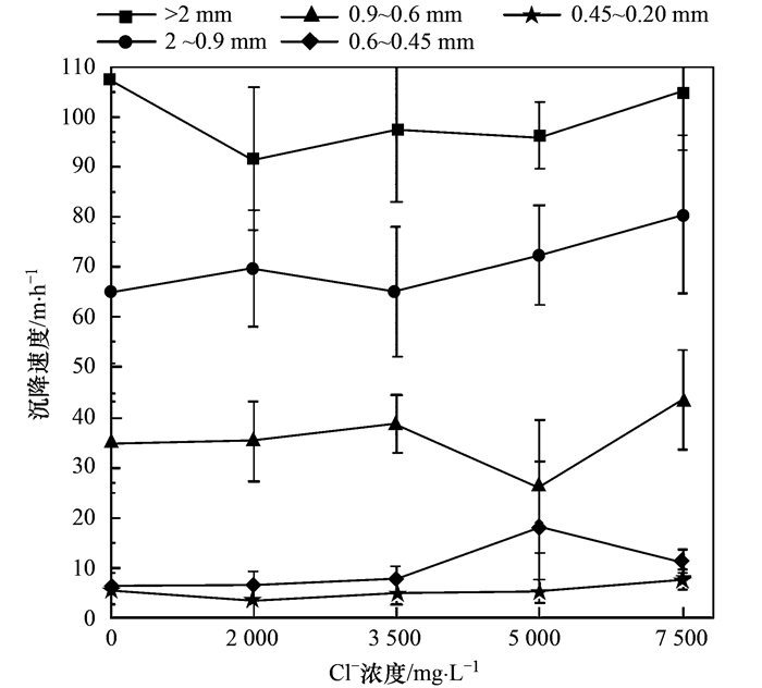 (2) 保持反應器COD容積負荷為3.267kg ·(m3 ·d)-1, 反應器中的厭氧顆粒污泥對于0~7500 mg ·L-1范圍內的Cl-濃度體現出良好的適應性, 大顆粒污泥在鹽度提升的影響下仍然占據反應器顆粒污泥的主體, 而在Cl-濃度短暫提升到10000 mg ·L-1的沖擊下, 粒徑較小的顆粒污泥容易受到影響, 出現解體現象.同等粒徑范圍內厭氧顆粒污泥的沉降性能在高鹽廢水的影響下有小幅度的提升, 并且大顆粒污泥的沉降速度保持在60 m ·h-1以上.