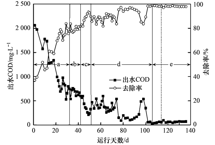 接種的厭氧顆粒污泥來自于某飲料生產企業的污水處理站UASB反應器中形成的顆粒污泥, 接種顆粒污泥體積占EGSB反應器總容積的50%.反應器水力停留時間(hydraulic retention time, HRT)為24 h, 回流比R為6 :1, 反應器溫度使用電阻絲溫控器控制在(35±2)℃, 進水pH值維持在6.8~7.2, 進水COD濃度維持在3267mg ·L-1, COD容積負荷為3.267kg ·(m3 ·d)-1.