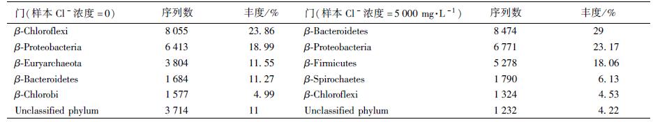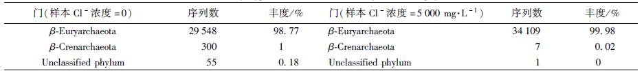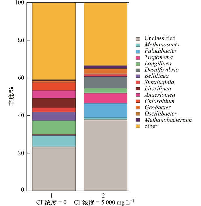 在鹽度的影響下, 微生物群落的優勢菌群變化很大. Cl-濃度為0時, 古菌中的優勢菌屬是Methanoregula與Methanothrix, 分別占總數的50.01%與32.59%, 而當Cl-濃度達到5000 mg ·L-1, 占據優勢的菌屬則是Methanobacterium(57.5%), Methanospirillum(21.9%)和Methanothrix(13.91%). Methanoregula屬于廣古菌門(β-Euryarchaeota)甲烷微菌目(β-Methanomicrobiales), 主要代謝底物是H2、CO2. Methanothrix之前曾用名是Methanosaeta, 屬于專性乙酸營養型產甲烷古菌, 有研究顯示Methanosaeta適于在高負荷下生長. Methanobacterium屬于廣古菌門甲烷桿菌目(β-Methanobacteriales), 可以利用H2、甲酸鹽、甲醇等底物生產甲烷, Methanospirillum屬于廣古菌門甲烷微菌目, 其主要代謝底物為甲酸. Methanoregula, Methanothrix, Methanobacterium, Methanospirillum等都是厭氧消化器中常見的產甲烷菌屬.