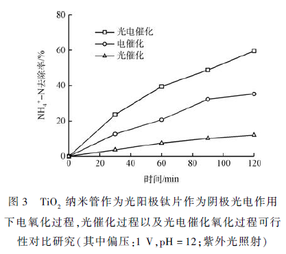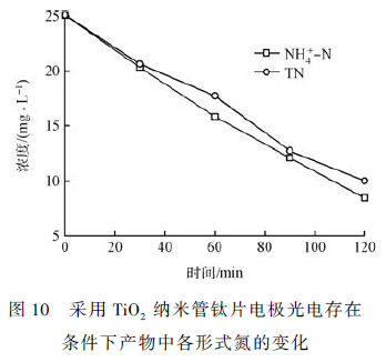 在提高含氮有機污染物降解率的研究中,將電化學和光化學氧化法相結合(光電協(xié)同) 的技術,即光電催化技術已成為目前研究的熱點之一 。將電化學法與光催化法聯(lián)合,簡稱“光電法 ”,是一種新型的高效的除氨氮的方法 。這種方法雖然單位時間的能耗較電化學法和光催化法略有增加,但氨氮去除率得到提高,從而使得能量利用率得到提升。本研究針對水體中廣泛存在的檸檬酸銨中氨氮難去除的現象,采用陽極氧化方法制備了二氧化鈦納米管電極,進行光電催化降解氨氮研究,結果表明2 h 能降解60% 以上,且產物80% 以上轉換為氮氣。