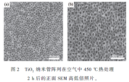 圖2 中的電鏡圖為陽極氧化法制備的TiO2 納米管陣列的SEM 圖。由圖2 可知,在TiO2 納米管陣列排列高度有序、管徑均勻、管口未被堵塞。