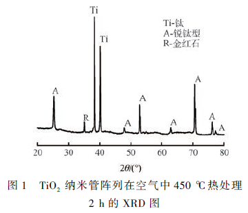 圖1 是陽極氧化法制備TiO2 納米管陣列的XRD 圖。在2θ 為25. 3°、37. 8°、48. 0°、54. 0° 和62. 8°出現衍射峰,表明此時的二氧化鈦納米管呈現銳鈦型結構。2θ = 35°為金紅石結構。即在此條件下TiO2 納米管膜層的晶型為銳鈦和金紅石的混合相。