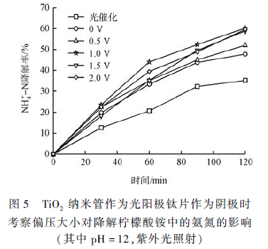 圖5 考察了在去除檸檬酸銨中氨氮的過程中保持其他條件不變改變施加偏壓的大小0 ~ 2. 0 V(0、0. 3、0. 5、1. 0、1. 5 和2. 0 V)對其去除的影響 。如圖6 所示,與不加偏壓相比,加偏壓時的光電催化降解效率明顯提高,且隨電壓的增大對檸檬酸銨中氨氮降解效果而增強。但1. 5 和2. 0 V 偏壓的效果與1 V 的數據接近,沒有明顯的提高。在1 V 時2 h 降解效果可達60. 2% ?紤]到能耗問題,所以在探索其他條件時偏壓設定為1 V。原因在于光強是一定的,光生載荷的總量是固定不變的,再增大電壓不能增加有效分離并遷移到外電路的光生電子數量,所以降解效果不會增加。