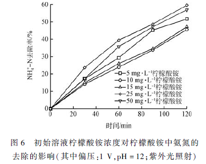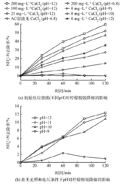 2)光電降解檸檬酸銨主要是由于光電協(xié)同作用將其中氨氮降解。檸檬酸銨必須在堿性條件下游離出來,Ca2 + 起到了加速破絡合作用。