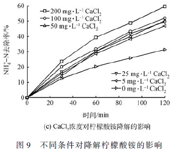 圖6 分別對比了在其他條件相同情況下改變投加量的初始檸檬酸銨的大小對氨氮去除的影響?梢钥闯,投加檸檬酸銨量越多去除效果越好。在初始濃度25 和50 mg·L - 1 時2 h 去除效果高達60% 左右。初始濃度5、10 和15 mg·L - 1 以N 計的檸檬酸銨時,2 h 去除效果分別為51. 7% 、45. 7% 和47. 2% 。原因在于加入的CaCl2 的量一定,檸檬酸銨的濃度越大,生成的檸檬酸鈣越多,反應越容易進行,從而去除效果越好?偟膩碚f,檸檬酸銨初始濃度不同對去除效果影響不大,沒有明顯的變化趨勢。