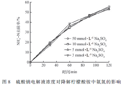 圖8 為改變Na2 SO4 電解質的濃度對降解檸檬酸銨中氨氮的影響?梢钥闯隽蛩徕c電解質濃度對檸檬酸銨中氨氮的降解影響不大。