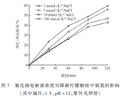 圖7 為在其他條件不變條件下改變NaCl 電解質的濃度對去除檸檬酸銨中氨氮的影響。由圖7 可知,隨著NaCl 電解質濃度的增加檸檬酸銨中氨氮去除的效果越佳。其中100 mmol·L - 1 NaCl 時2 h 去除效果可達60% 左右。