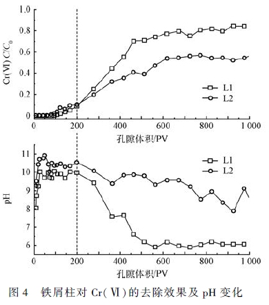 而對于L2,其體系內的pH 變化滯后于L1,特別是198 PV 之后,L1 和L2 的出水pH 差異明顯。L1的出水pH 值迅速下降,300 PV 時,就已經達到9 以下,而L2 直到725 PV 之前出水pH 一直大于9,之后的出水pH 也一直維持在8 以上,而L1 卻在563 PV之后恢復到入水pH 值6 左右。2 個柱子中的pH 差異明顯,一方面是由于L2 中與Cr(Ⅵ) 同時通入的NO3- 與Fe0 反應過程中消耗H + ,可以增大pH值;另外一方面原因可能是由于NO3- 與Fe0 反應過程生成的副產物磁鐵礦(Fe3 O4 )。以往的研究證明Fe3 O4 具有阻滯反應產物在Fe0 表面堆積和促進電子傳導作用 ,從而促進了Fe0 對Cr(Ⅵ)的還原,進一步增大了L2 體系的pH 值。除此之外,雖然Fe3 O4 基本不與NO3- 發生氧化還原反應 ,但是Fe3 O4 卻可以將Cr(Ⅵ)還原,一定程度上促進了Cr(Ⅵ)的去除。