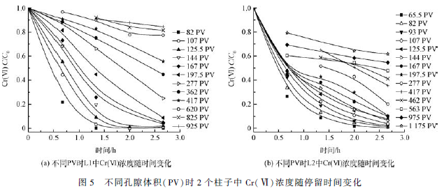 為了進一步探討NO3- 的影響機理,把L2 作為研究對象,對比L1 和L2 不同孔隙體積間的Cr(Ⅵ)濃度變化。