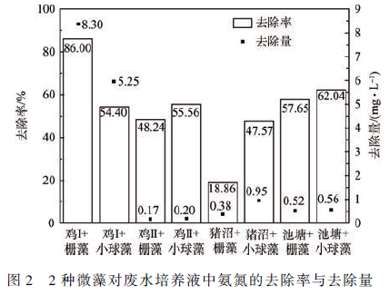 由表1 可見,雞Ⅱ和豬沼培養液中硝氮的濃度大于氨氮濃度,氨氮的抑制作用較弱,2 種微藻對硝氮的吸收利用較多。尤其在豬沼中,雖然2 種微藻的去除率都不高,但是去除的絕對量最多(柵藻9. 86mg·L - 1 ,小球藻9. 82 mg·L - 1 )。對于雞Ⅰ和池塘培養液,雖然氨氮濃度大于硝氮,抑制作用強,但因其初始值很低,故而雖實際的去除量并不大但去除效率高。有研究結果顯示,硝氮較適合普通小球藻的生長。因此,在硝氮含量最高的豬沼培養液中收獲的小球藻藻粉質量也最多。對比2 種微藻對硝氮的去除率發現,柵藻對硝氮的吸收同化效果稍好于小球藻。